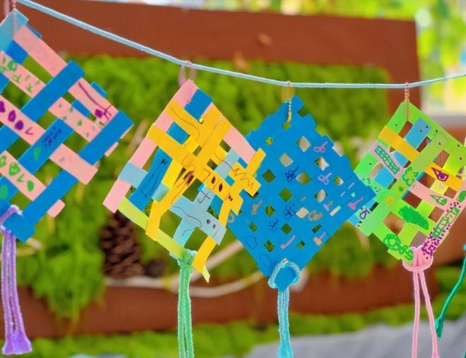 竹编,作为一项历史悠久的非遗技艺,承载着古人的智慧与审美。在美劳室,孩子们以纸片代替竹片,用纸条编织出属于自己的非遗小天地。当一个个色彩鲜艳、充满童趣的纸片书法挂件完成时,孩子们兴奋地互相展示。“老师你看,我的竹编挂件上有我喜欢的诗!”“我的挂件能带来好运呢!”孩子们的脸上洋溢着自豪与喜悦,竹编这一非遗技艺已经在他们心中留下了美好的印记。